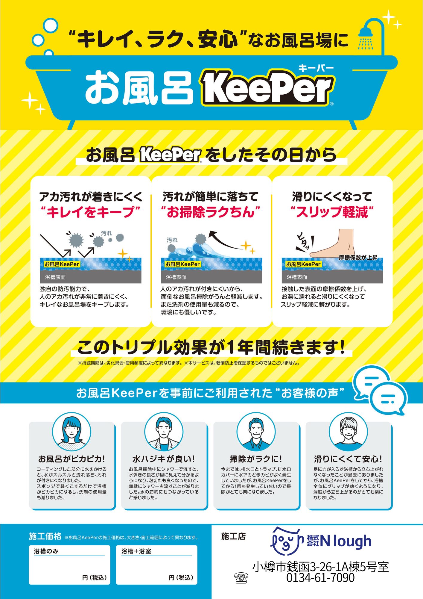 株式会社 N lough は小樽市・札幌市の給水装置工事指定工事店として、水道・給湯など水回り設備の工事を行っています。コーティング施工の際には、水漏れの有無や配管・給水まわりの状態もあわせて確認します。気になる点があれば、その場で状況や今後のメンテナンスの考え方を説明します。